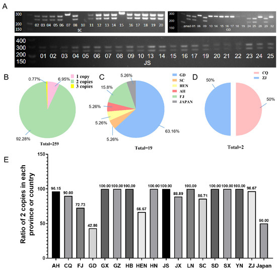 Distribution of copy number variations among different B. xylophilus strains. (A) Partial visualization result of CNV found in different nematode strains, SC means Sichuan province, GD means Guangdong, JS means Jiangsu, and the numbers indicate sample ID. (B) Percentage of different copies found in 259 B. xylophilus strains. (C) Geographical distributions of nematode strain with one copy, GD means Guangdong province, SC means Sichuan, HEN means Henan, AH means Anhui, and FJ means Fujian. (D) Geographical distributions of nematode strain with three copies, CQ means Chongqing, ZJ means Zhejiang. (E) Bar plot of the geographical distributions of B. xylophilus strains with two copies, AH means Anhui, CQ means Chongqing, FJ means Fujian, GD means Guangdong, GX means Guangxi, GZ means Guizhou, HB means Hubei, HEN means Henan, HN means Hunan, JS means Jiangsu, JX means Jiangxi, LN means Liaoning, SC means Sichuan, SD means Shandong, SX means Shaanxi, YN means Yunnan, ZJ means Zhejiang.