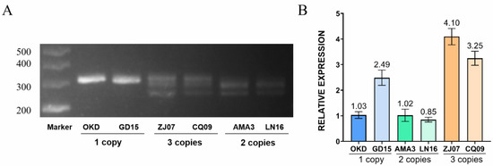 The genomic DNA was extracted based on CTAB methods [43]. Specific primers for CNV identification were identified in our early study based on tandem repeat variations that occurred among different copies of GH45 genes (sense primer: CGTGGTGGAAGGTAAGAC, antisense primer: GTTGGAGTGGTGCTTGAT) [16]. PCR was conducted using the following procedure: 94 °C for 2 min, followed by 35 cycles (94 °C for 30 s, 58 °C for 30 s, and 72 °C for 30 s), and 72 °C for 10 min. The exact copy numbers can be assessed based on fragment lengths by visualizing the PCR products with 3% agarose gel electrophoresis.
