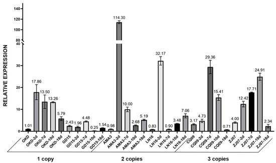The aforementioned 6 B. xylophilus strains were inoculated on P. thunbergii to detect their post-inoculation expression changes, respectively. Relative expression of each strain was quantified after inoculating for 2 days, 7 days, 10 days and 18 days. In general, the expression of the GH45 gene began to boost significantly after inoculation for 2 days and eventually declined after 18 days; meanwhile, strains with different copies exhibited different expression patterns (Figure 3). Strains with two GH45 copies showed the highest expression levels on day 2 but decreased sharply on the following days. Strains with one copy showed the average lowest expression levels and decreased eventually on day 18. Strains with three copies showed medium expression level and shared similar patterns with one copy strains.