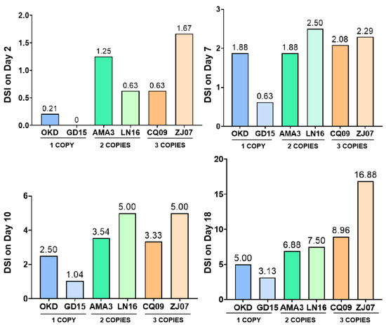 The pathogenicity of the 6 B. xylophilus strains was also determined by calculating the disease severity index (DSI) at each sampling time. The DSI in the early stage (days 2, 7, and 10) did not show obvious differences among different strains since the symptoms were too mild to be classified (Figure 4). The DSI observed on day 18 suggested that strains with three copies of the GH45 gene could cause the most severe symptoms on pine trees, followed by strains with two copies, while the least severe symptoms were observed on strains with one copy (Figure 4). In combination with the expression and DSI results, we proposed that B. xylophilus strains with more copies of the GH45 gene would result in higher expression levels and induce more severe damage to the pine trees.