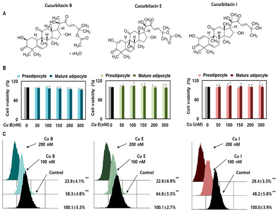 Effects of Cu B, Cu E, and Cu I on cell viability and Nile red-O staining activity. The chemical structures of Cu B, Cu E, and Cu I (A). Effects of Cu B, Cu E, and Cu I (50, 100, 150, 200, 300 nM) on the viability of pre-adipocytes and mature adipocytes. Gray is preadipocyte control, black is mature adipocyte control (B). Nile-red staining activity of Cu B, Cu E, and Cu I (50, 100, 150, 200, 300 nM) using flow cytometry (C). Results are expressed as mean ± SEM (n = 3 per group). ** p < 0.01 indicates a statistically significant difference as compared to control group. Cu B, Cucurbitacin B; Cu E, Cucurbitacin E; Cu I, Cucurbitacin I.