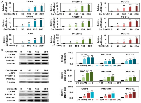 The effects of Cu B, Cu E, and Cu I on mRNA and protein expression levels of UCP1, PRDM16, and PGC1a. (A) Transcript expression levels of UCP1, PRDM16, and PGC1a of Cu B, Cu E, and Cu I (50, 100, 150, 200 nM), as measured using RT-qPCR. (B) Translation expression levels of aUCP1, PRDM16, and PGC1a, as measured using Western blotting (100, 150, 200 nM). Results are expressed as mean ± SEM (n = 3 per group). * p < 0.05 and ** p < 0.01 indicate a statistically significant difference as compared to control group.