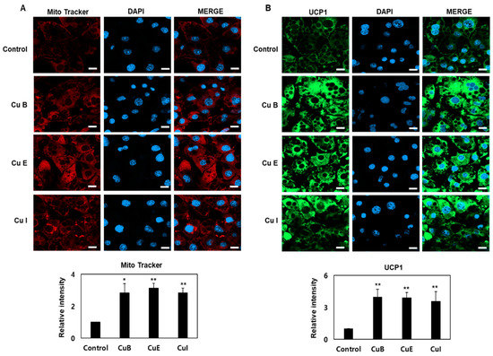 To detect UCP-1 expression, adipocytes were seeded in 8-well chamber slides. After incubation and Cu B, Cu E, and Cu I treatment using the method described in Section 2.1, the samples were rinsed three times with PBS. After fixation in 4% paraformaldehyde, they were permeabilized for 15 min using 0.1% Triton X diluted in PBS. The adipocytes were then blocked with 5% bovine serum albumin for 1 h at 37 °C, washed with PBS, and then incubated with primary antibody against UCP-1 (1:200) overnight at 4 °C in a humid chamber. The next day, the 8-well chamber slides were carefully rinsed, and the nuclei were counterstained with DAPI loading medium for 5 min. Finally, slides from each of the three fields were randomly selected for microscopy using a Zeiss LSM 800 confocal laser-scanning microscope (Carl Zeiss, Oberkochen, Germany). Relative intensities were acquired using Zeiss ZEN blue edition (Version 3.3.89.0000, Carl Zeiss, Oberkochen, Germany) and ImageJ software (version 1.48) in duplicate.