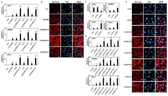 As a hydrolase, PLD2 breaks down phosphatidylcholine to phosphatidic acid and choline. PLD2 has been reported to be involved in cell migration through cytoskeletal tissue, cell proliferation, death, and differentiation [30,31]. However, the role of PLD2 in the transformation of white adipocytes to brown adipocytes has not yet been clearly investigated. Therefore, to investigate the role of PLD2 in adipocyte browning, CAY10594, a representative PLD2 pharmacological inhibitor, was treated alone or in combination with Cu B, Cu E, and Cu I to investigate adipocyte browning. It was confirmed that the mRNA level of UCP1 increased by 6.6 times compared with that in the control when CAY10594 was used alone. When CAY10594 alone was applied, PRDM16 and PGC1a mRNA levels increased 9.2-fold and 8.9-fold, respectively, compared with those in the control group (Figure 5A). These results confirmed that the expression levels of representative browning markers UCP1, PRDM16, and PGC1a were increased by the PLD2 pharmacological inhibitor. To investigate how the effects of these PLD2 pharmacological inhibitors are modulated by Cu B, Cu E, Cu I, and CAY10594, Cu B, Cu E, and Cu I were treated simultaneously. As a result, it was confirmed that the mRNA expression levels of UCP-1 of Cu B, Cu E, and Cu I were increased by more than seven times compared to the case of treatment with CAY10594 alone. In addition, it was confirmed that the PRDM16 and PGC1a mRNA levels of Cu B, Cu E, and Cu I increased by more than three times and more than four times, respectively, compared to CAY10594-alone treatment (Figure 5A). Next, to investigate the effect of PLD2 pharmacological inhibitors on mitochondrial biosynthesis, MitoTracker staining and confocal microscopy were performed. The intensity of MitoTracker staining increased by 2.8 times compared with that of the control group when CAY10594 alone was used. In addition, it was confirmed that when CAY10594 and Cu B, Cu E, and Cu I were treated simultaneously, Cu B increased 2.6 times, Cu E 3.7 times, and Cu I 2.1 times compared to CAY10594 treatment alone (Figure 5B). We found that the inhibition of PLD activity by CAY10594 affected browning-associated protein expression levels. Since CAY10594 may have a slight non-specific inhibitory effect on PLD2, the expression level of browning-related proteins was confirmed by removing the expression of PLD2 using the Si RNA system. We investigated PLD2 downregulation by using siRNA. The transcription level of PLD2 was significantly downregulated by PLD2-siRNA (si-PLD2); therefore, PLD2-siRNA was used in the subsequent experiments. It was confirmed that the transcription levels of UCP-1, PRDM16, and PGC1a were increased in the si-PLD2 single group, similar to the result of treatment with CAY10594 alone (Figure 5C). In addition, it was confirmed that the transcription levels of UCP-1, PRDM16, and PGC1a increased more than 8-fold when cells were treated with Cu B, Cu E, Cu I, and si-PLD2 (Figure 5D). In mitochondrial biosynthesis, when Cu B, Cu E, Cu I, and si-PLD2 were used together, it was confirmed that the increase was more than five times that of the si-PLD2 group (Figure 5E). From these results, it was confirmed that specific inhibition of PLD2 promotes the browning of white adipocytes, and this effect is significantly increased when Cu B, Cu E, Cu I, and si-PLD2 are treated together.