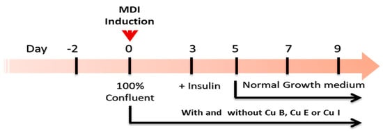 Immobilized murine pre-adipocytes 3T3-L1 were obtained from the American Type Culture Collection (Manassas, VA, USA) and cultured in Dulbecco’s modified Eagle’s medium/nutrient mixture F-12 (DMEM/F-12) with 10% FBS and 1% penicillin/streptomycin at 37 °C in humidified 5% CO2 and 95% air. To establish mature adipocytes, pre-adipocytes were cultured until 100% confluence was achieved. To obtain mature adipocytes from pre-adipocytes, MDI differentiation medium (1 μM dexamethasone, 500 μM IBMX, 1.5 μg/mL insulin, and 1 μM rosiglitazone) was added for 3 days. Then, DMEM/F-1 containing 1.5 μg/mL insulin was added for 2 days. Thereafter, the medium was replaced every 2 days, and 9 days after treatment with the total MDI differentiation medium, it was used for each experimental purpose. Cu B, Cu E, and Cu I were dissolved in dimethyl sulfoxide (DMSO) so that the final concentration in the medium was 0.1%, added together during the treatment of MDI differentiation medium, and added every time the medium was replaced for nine days of culture. To evaluate the ability to induce beige adipocyte, Cu B, Cu E, and Cu I (200 nM) were added 2 h before treatment with MDI differentiation medium (Figure 6).