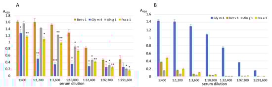 ELISA with the birch Bet v 1, the alder Aln g 1, the soybean Gly m 4 and the strawberry Fra a 1 using polyclonal rabbit anti-Bet v 1 (A) or rat anti-Gly m 4 (B) IgG. Error bars represent standard deviation between technical replications. Differences in mean A values between Bet v 1 (A) or Gly m 4 (B) and other allergens were compared by t-test (significance levels are: (A) * p < 0.05, ** p < 0.01, *** p < 0.005 (A); (B) p < 0.001 for Bet v 1, Aln g 1 and Fra a 3 in all serum dilutions).