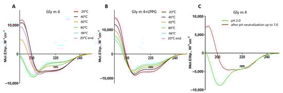 Effects of heating without (A) or in the presence of the lysolipid LPPG (at the final concentration of 1 mM) (B) and pH change (C) on the secondary structure of the soybean allergen Gly m 4. 20 °C end—the CD spectrum of Gly m 4 at 20 °C after cooling down from 98 °C.