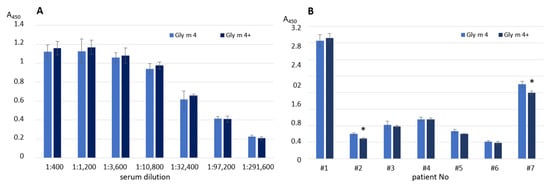 Effects of Gly m 4 heating on the binding of polyclonal rat anti-Gly m 4 IgG (A) or human IgE from sera of allergic patients (B). Gly m 4, Gly m 4+—the intact and preheated allergen, respectively. Error bars represent standard deviation between technical replications. Differences in mean A values between intact and preheated Gly m 4 for each patient were compared by t-test (significance levels is * p < 0.05).