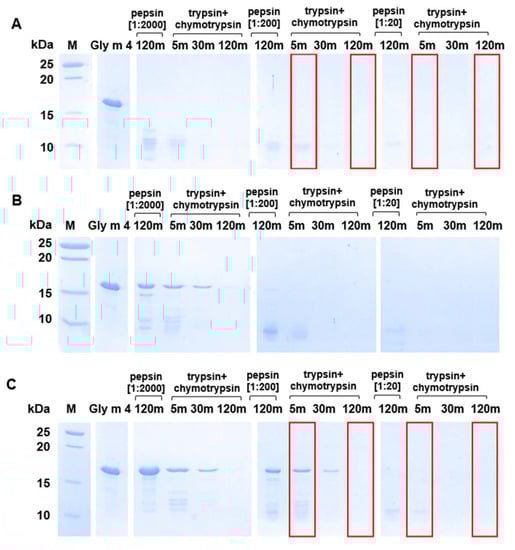 Effects of different gastric pH values ((A)—pH 2.0; (B)—pH 3.5; (C)—pH 5.0) and pepsin loadings (1:2000, 1:200, and 1:20—enzyme-to-allergen mass ratios) on gastroduodenal digestion of Gly m 4, as detected by SDS-PAGE (15%T, 3%C in the separating gel). Gly m 4—the intact allergen; 5 m, 30 m, and 120 m—digestion time, min. M—molecular mass standards. Red frames show Gly m 4 digests which were used in IgE-binding experiments.