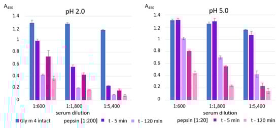 ELISA with the intact Gly m 4 and its gastroduodenal digests obtained at different gastric pH values (pH 2.0 and 5.0) and pepsin-to-allergen mass ratios (1:200 and 1:20) using the polyclonal rat anti-Gly m 4 IgG (t—5 min and t—120 min—time of the allergen digestion with the mixture of trypsin and α-chymotrypsin after Gly m 4 preliminary degradation by pepsin). Error bars represent standard deviation between technical replications.