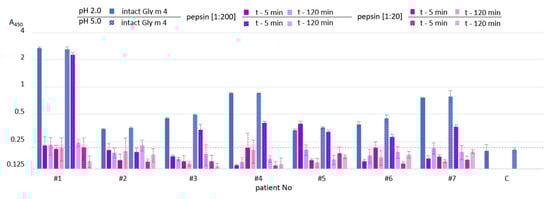 ELISA with the intact Gly m 4 and its gastroduodenal digests obtained at different gastric pH values (pH 2.0 (solid color) and 5.0 (pattern color)) and pepsin-to-allergen mass ratios (1:200 and 1:20) using human IgE from sera of allergic patients (t—5 min and t—120 min—time of the allergen digestion with the mixture of trypsin and α-chymotrypsin after Gly m 4 preliminary degradation by pepsin). C—the control serum from a non-allergic individual. Dotted line shows baseline absorbance corresponding to the control serum. Error bars represent standard deviation between technical replications.