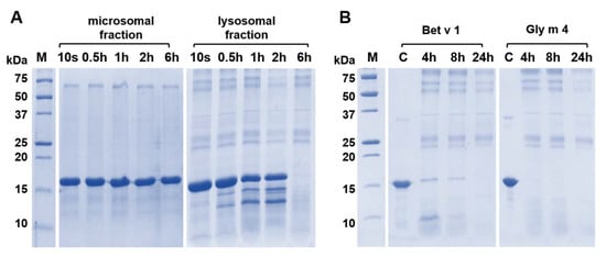 In the next step, we compared the degradation potential of both these fractions. To do this, the soybean Gly m 4 was incubated with equal amounts of the total protein content of microsomal and lysosome-enriched fractions, upon that the samples from the reaction mixture were collected at different time points (0 s, 0.5 h, 1 h, 2 h, and 6 h) and the results were analyzed with SDS-PAGE (Figure 7A). It was shown that the lysosome-enriched fraction had much more pronounced degradation potential, as traces of the fragments were evident during just 30 min. This supports our suggestion that microsomal and lysosomal fractions have different degradation potential in vitro, and we believe that the lysosomal fraction should be used in the endolysosomal degradation assay while studying an allergenic potential of various proteins in vitro.