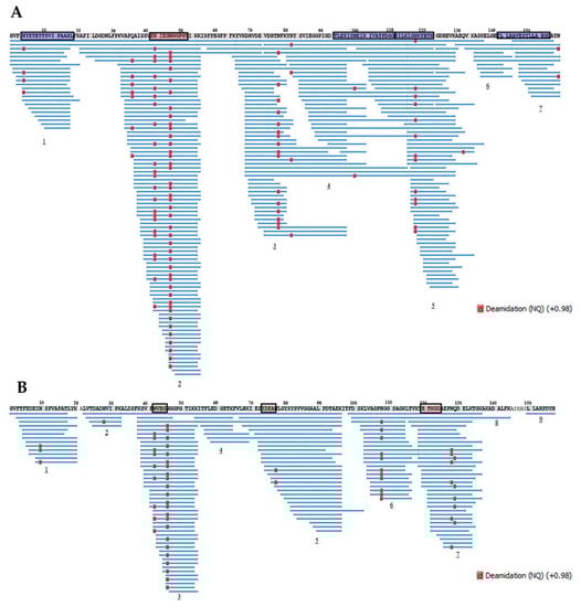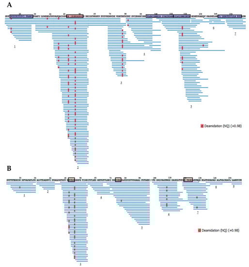 The fragments of Bet v 1 (A) and Gly m 4 (B) resulted from allergens degradation in vitro by lysosomal enzymes of human macrophages for 24 h. Numbers 1–9 show the main clusters of peptide fragments of the investigated birch and soybean allergens. Dominant IgE-binding linear epitopes of Bet v 1 [] and Gly m 4 [] are framed in red. Dominant T-cell epitopes of Bet v 1 [] are framed in blue.