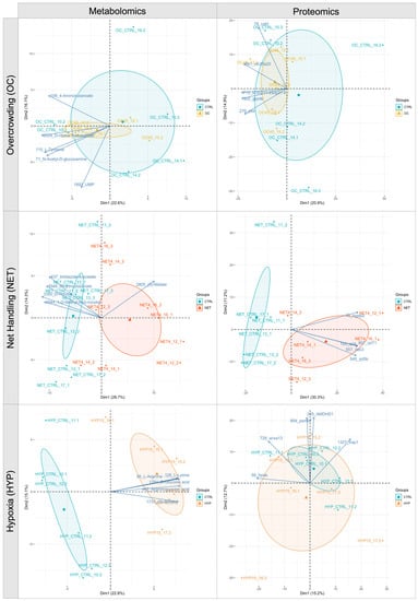 Principal component analysis (PCA) biplots of the liver proteomics and metabolomics data of gilthead seabream subjected to overcrowding (OC), net-handling (NET) and hypoxia (HYP) challenges. Each point represents a biological replicate’s projection, and experimental groups within trials are represented by a unique color, as indicated in each legend. The largest point represents the group mean. The axes’ percentages indicate the proportions of explained variance. The arrows depict the top-five most weighted variables.