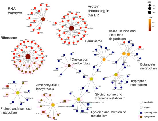 An overrepresentation analysis (ORA) of differential proteins and metabolites from NET fish liver resulted in 12 overrepresented KEGG terms with FDR < 0.05, the three most enriched being ribosome (FDR = 1.032 × 10−22), protein processing in endoplasmic reticulum (ER) (FDR = 2.384 × 10−14) and one-carbon pool by folate (FDR = 0.002) (Figure 2; Table S6). Regarding the HYP analysis, 11 enriched terms were revealed: ABC transporters (FDR = 4.926 × 10−8), aminoacyl-tRNA biosynthesis (FDR = 0.003) and alanine, aspartate, and glutamate metabolism (FDR = 0.003) were the three most enriched (Figure S1). No joint pathway analysis (JPA) was performed for the OC data because no DAMs were identified by univariate hypothesis testing.