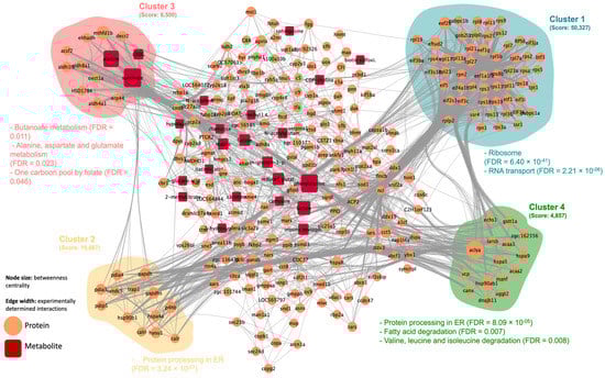 A metabolic reaction network (metabolite protein) was generated for each trial, i.e., NET and HYP, with the corresponding DAPs and DAMs. The topological analysis on Cytoscape revealed a network with 296 nodes, 3176 edges, and a clustering coefficient of 0.428, for the NET trial, with four main clusters highlighted by MCODE plugin (Figure 3). The top three nodes with the highest betweenness centrality were succinate, phenylalanine, and alanine. The JPA conducted on each cluster individually showed that the enriched KEGG terms were involved mainly in translation, folding processes, and amino acid metabolism (Figure 3). The HYP trial DAPs and DAMs generated a network with 71 nodes, 438 edges, a clustering coefficient of 0.704, and 1 highly interconnected cluster identified by MCODE. Proteins in this cluster were enriched mainly in KEGG terms related to amino acids, nucleotides, and lipid metabolism. The highest betweenness centrality values were attributed to phosphate, ATP, and ADP metabolites (Figure S2).