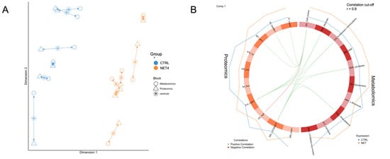 A multivariate statistical analysis was performed by using R v.4.2.0 [] for MacOSX. Group separation and replicates’ variability were analyzed, for each data modality, through PCA, using the prcomp R function in the autoscaled matrices. Missing values were imputed on the basis of the feature median. Biplots were generated by using the R package factoextra []. Data integration analysis for biomarker discovery using latent components (DIABLO), within the R package mixOmics [], was used to perform the integrative analysis of proteomics and metabolomics datasets (identified proteins and metabolites) and depict the 10 most-correlated and -discriminatory features between both data modalities. The parameters of the final DIABLO model were tuned based on three-fold cross validation repeated five times and using the centroids distance as distance metric.