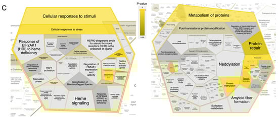 DIABLO was used to perform a correlation analysis between both data modalities and to depict each trial’s 20 most-discriminatory features (10 metabolites and 10 proteins). The arrow plot (Figure 4A) of the first two components of the NET DIABLO model showed that group separation was achieved over the first dimension and that replicates’ variability was consistent across omics datasets. Proteomics and metabolomics data showed a Pearson correlation of 0.95 on the first component, with six proteins and five metabolites showing r > 0.9, as demonstrated in the circos plot from Figure 4B. The features from the first component were then subjected to an ORA on the REACTOME database (Table S7), according to their expression patterns, to depict the biological functions and pathways that were most affected by the NET challenge (Figure 4C). A total of 106 terms presented FDR < 0.05, for the upregulated proteins and metabolites, where transport of small molecules (FDR = 2.19 × 10−2), cellular responses to stimuli (FDR = 2.19 × 10−2) and metabolism of proteins (FDR = 2.19 × 10−2) were the three most enriched higher-level terms. In the case of the downregulated features, 10 lower-level terms showed FDR < 0.05, being mostly implicated in the metabolism of certain amino acids and peroxisomal processes. Regarding the HYP trial, the final DIABLO model calculated two components that could separate control from the hypoxia challenged group along the dimension 1 axis, according to the arrow plot in Figure S3A. The Pearson correlation between both data modalities on the first component was 0.96, while four proteins and six metabolites among the selected features demonstrated r > 0.8 (Figure S3B). A REACTOME overrepresentation analysis of the selected upregulated and downregulated features (Figure S3C) showed that 84 terms were upregulated (FDR < 0.05), the transport of small molecules (FDR = 6.91 × 10−3), metabolism (FDR = 2.16 × 10−2), and cellular responses to stimuli (FDR = 6.47 × 10−2) being the most enriched. On the other hand, among the 77 downregulated terms with FDR < 0.05, the three most enriched were mainly integrating energy metabolism, protein repair, and the metabolism of vitamins and cofactors.