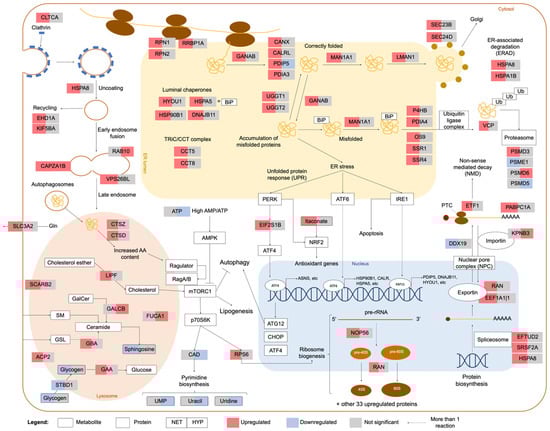 In this study, the numbers of dysregulated proteins and metabolites in the liver suggested that net handling was the challenge that induced the most intense metabolic reprogramming in gilthead seabream (349 DAPs and 40 DAMs vs. 46 DAPs and 58 DAMs in the HYP trial and 40 DAPs and 0 DAMs in the OC trial), most likely related to its severity (11/2 months compared with the 48 h of the hypoxia challenge). These results might also suggest a multistress effect, as recently proposed [], which might have resulted from a synergetic combination of net handling and air exposure. Previous plasma and liver analyses conducted on these same fish, published elsewhere [,], also verified this same difference in response to these different challenges. According to the ORA performed with REACTOME on the NET proteins and metabolites selected by the DIABLO model (Table S7), terms related to the metabolism of amino acids, amino acid transport across the plasma membrane, unfolded protein response (UPR), and translation were included among the most enriched ones. Notably, pathways related to the catabolism of amino acids were mainly downregulated, whereas pathways related to the biosynthesis of a specific set of amino acids were essentially upregulated. Simultaneously, amino acid transport, translation, and UPR were upregulated (Figure 4C). These results suggest that net handling most likely induced cellular stress and that challenged fish coped with the stress by activating this prosurvival pathway, i.e., UPR. UPR is directly and indirectly related to the other overrepresented pathways through different regulatory processes, in an intricate network of signaling pathways to ensure cell survival and tissue homeostasis, as will be further discussed. The protein–metabolic interaction network also demonstrated this interconnection between these pathways (Figure 3).
