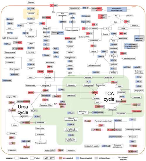 Overview of the metabolic pathways affected by net handling and hypoxia in gilthead seabream hepatocytes. The proteins and metabolites represented were significantly different in abundance, according to a Student’s t-test with FDR controlled at 0.05.