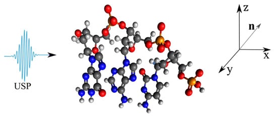 Although one can see that the Equation (2) does not contain values characterizing USPs, this question deserves a separate consideration. Indeed, particular attention is now being paid to the physics of USPs, namely, the methods for generating such pulses and their interaction with matter [,,]. Using such USPs, one can investigate the structure of complex substances with an advanced structure with high temporal and spatial resolution. Moreover, it is now technically possible to carry out such studies, e.g., using XFELs [] free-electron lasers. Such lasers can generate USPs not only of femtosecond but also of attosecond duration [,]. Despite this, old theoretical approaches for “deciphering” polyatomic system structures based on the use of Equations (1) and (2), which do not take into account the features of interaction of such USPs with complex polyatomic structures are currently used [,,,,].