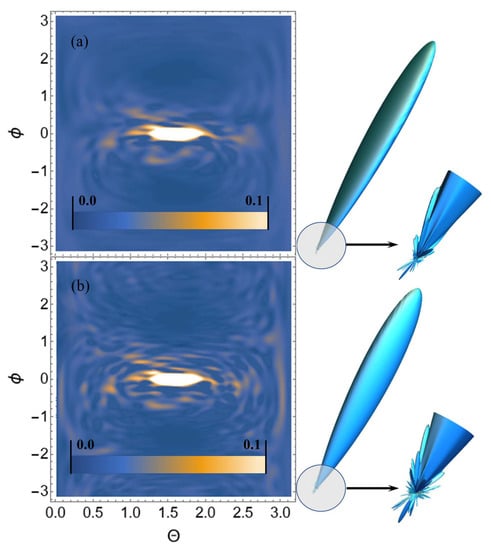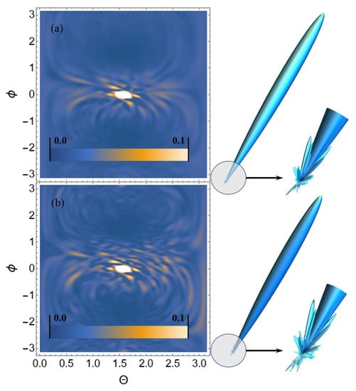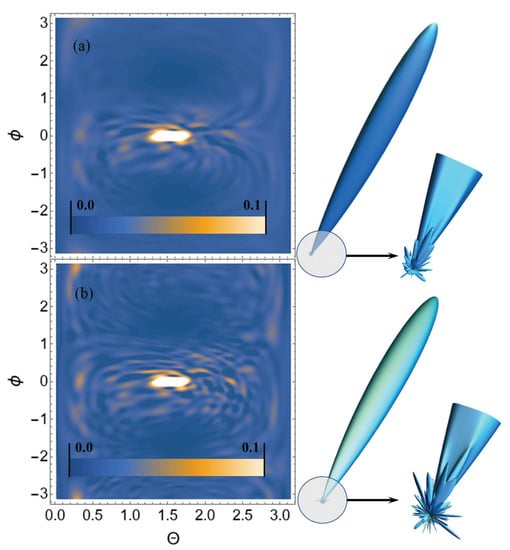 USP scattering spectra on the CAG trinucleotide: (a) calculated using Equation (4), (b) calculated by Equation (1). The spectra are presented as 2D (left) and 3D (right) plots. The 2D plots are presented in dimensionless units and normalised to the maximum value of the spectrum. The angles , are spherical angles in the coordinate system shown in Figure 1.