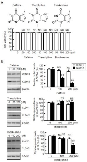Effects of methylxanthine derivatives on cell viability and CLDN expression in A549 cells. (A) The structures of caffeine, theophylline, and theobromine are shown in the upper panel. Cells were incubated with caffeine, theophylline, or theobromine at the indicated concentrations for 24 h, followed by incubation with CCK-8 reagent. Cell viability is represented as a percentage relative to 0 μM. (B) The expression levels of CLDN1, CLDN2, and β-actin were examined by Western blotting. The protein levels of CLDN1 and CLDN2 are represented as a percentage relative to 0 μM. n = 4–7. ** p < 0.01 and NS p > 0.05 compared with 0 μM.