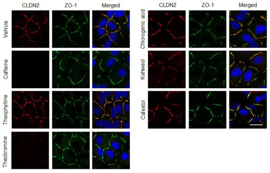 So far, we reported that CLDN2 is mainly colocalized with zonula occludens-1 (ZO-1) at the cell–cell border area in A549 cells using fluorescence measurements [7]. The red signal of CLDN2 expression was detected at the cell–cell border area, which was diminished by caffeine and theobromine (Figure 3). On the other hand, the green signal of ZO-1 expression was unchanged. Additionally, other coffee ingredients had no effect on the cellular localization of CLDN2 and ZO-1. The effects of caffeine and theobromine on CLDN2 expression found in immunofluorescence assays coincide with those by Western blotting.