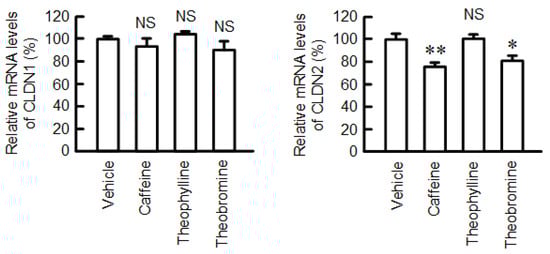 Effects of coffee ingredients on the mRNA levels of CLDNs. The mRNA levels of CLDN1 and CLDN2 were measured using real-time PCR and are represented as a percentage relative to vehicle. n = 3–4. ** p < 0.01, * p < 0.05, and NS p > 0.05 compared with vehicle.