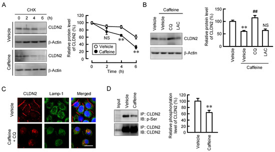 The mRNA level of CLDN2 was decreased by both caffeine and theobromine, but not by theophylline (Figure 4). The mRNA level of CLDN1 was unaffected by these methylxanthines. As shown in Figure 1B, the protein level of CLDN2 was significantly reduced by 200 µM caffeine (approximately 80%), whereas it had less effect on mRNA levels (approximately 20%). Therefore, we examined the effects of caffeine on the protein stability of CLDN2 using treatment with cycloheximide (CHX), a translational inhibitor. The decrease in the protein levels of CLDN2 was enhanced by caffeine (Figure 5A). However, the caffeine-induced CLDN2 reduction was rescued by chloroquine, a lysosome inhibitor, but not by lactacystin, a proteasome inhibitor (Figure 5B). In immunofluorescence measurements, CLDN2 was colocalized with Lamp-1, a lysosome marker, in caffeine- and chloroquine-treated cells (Figure 5C). The stability of CLDN2 protein in TJs is upregulated by the phosphorylation of Ser208 [25]. The phosphoserine level of CLDN2 was significantly decreased by caffeine (Figure 5D).