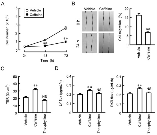 Effects of caffeine and theophylline on cell proliferation, migration, and paracellular barrier function. (A,B) Cells cultured on 6 cm dishes were incubated in the absence (vehicle) or presence of 200 μM caffeine. In the proliferation assay, cell images were obtained at 24, 48, and 72 h, and the number was calculated. In the wound-healing assay, cell images were obtained at 0 and 24 h after wound creation, and the remaining wound area was calculated. (C,D) Cells cultured on Transwell inserts were incubated in the absence (vehicle) or presence of 200 μM caffeine or theophylline for 24 h. TER was measured using a volt ohm meter. The fluxes of LY and DXR were measured using a microplate reader. Then, the solution in the basal compartment was collected, followed by a measurement of the fluorescence intensity. n = 4. ** p < 0.01 and NS p > 0.05 compared with vehicle.