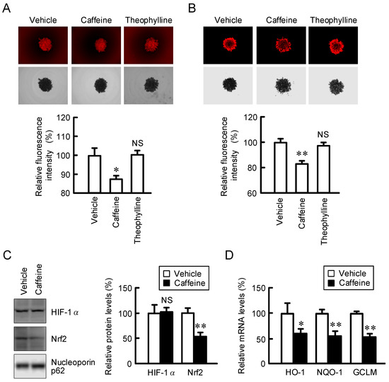 Effects of caffeine and theophylline on stress signals in spheroid cells. Spheroid cells were pre-incubated in the absence (vehicle) or presence of 200 μM caffeine or theophylline for 24 h. (A,B) The cells were incubated with hypoxia marker LOX-1 (A) and ROS marker CellRox Deep Red (B). The upper and lower panels indicate fluorescence and bright field images, respectively. The fluorescence intensity is represented as a percentage relative to vehicle. (C) The protein expression of HIF-1α, Nrf2, and nucleoporin p62 (a loading control) in spheroids was examined using Western blotting and represented as a percentage relative to vehicle. (D) The mRNA expression levels of HO-1, NQO-1, and GCLM in spheroids were examined using real-time PCR and represented as a percentage relative to vehicle. n = 3–7. ** p < 0.01, * p < 0.05, and NS p > 0.05 compared with vehicle.