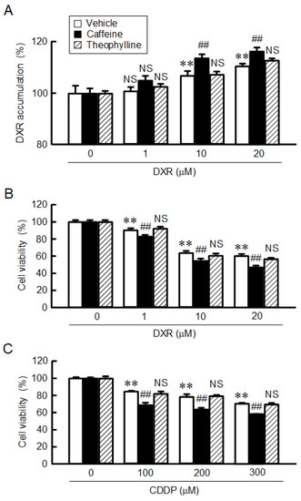 Enhancement of anticancer-drug-induced toxicity in spheroids by caffeine. (A) Spheroids were incubated in the absence (vehicle) or presence of 200 μM caffeine or theophylline for 1 h. The fluorescence intensity of DXR in the spheroids was examined using fluorescence microscopy and represented as a percentage relative to 0 μM (autofluorescence). (B,C) After incubation of the spheroids in the absence (vehicle) or presence of 200 μM caffeine or theophylline 24 h, followed by incubation with DXR and CDDP at the indicated concentrations. Cell viability was measured using a CellTiter-Glo 3D Cell Viability Assay kit and represented as a percentage relative to 0 μM DXR. n = 4–6. ** p < 0.01 compared with 0 μM DXR or CDDP. ## p < 0.01 compared with vehicle. NS p > 0.05 compared with 0 μM or vehicle.