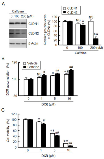 Effect of caffeine on CLDN2 expression and DXR-induced toxicity in RERF-LC-MS cells. (A) Cells were incubated with caffeine at the indicated concentrations for 24 h. The expression levels of CLDN1, CLDN2, and β-actin were examined using Western blotting. The protein levels of CLDN1 and CLDN2 are represented as a percentage relative to 0 μM. (B) The spheroids were incubated in the absence (vehicle) or presence of 200 μM caffeine for 1 h. The fluorescence intensity of DXR is represented as a percentage relative to 0 μM. (C) After incubation of the spheroids in the absence (vehicle) or presence of 200 μM caffeine for 24 h, followed by incubation with DXR at the indicated concentration. Cell viability is represented as a percentage relative to 0 μM DXR. n = 3–8. ** p < 0.01, * p < 0.05 and NS p > 0.05 compared with 0 μM caffeine or DXR. ## p < 0.01 and # p < 0.05 compared with vehicle.
