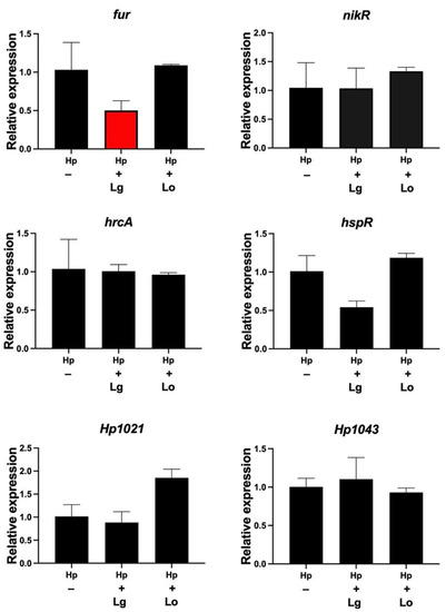 L. gasseri CM affects fur gene expression. Gene expression of H. pylori (Hp) transcription factors analyzed by qPCR after incubation for 2 h in CM from L. gasseri or L. oris (Lo). Target mRNA levels were normalized to those of the housekeeping gene gyrB. Gene expression levels in the control were set to 1. Data are presented as the means and standard deviation of duplicate samples and are average of three independent experiments.