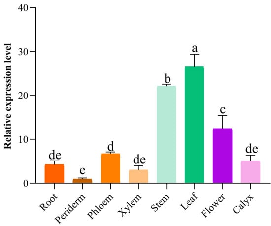Expression profiles of SbMYB12 in different tissues of S. baicalensis. The data represent the means of three biological replicates, and the error bars indicate the standard deviation (SD). Significant differences between means were identified (depicted by different letters; p < 0.05) using one-way ANOVA (followed by Tukey’s comparisons).