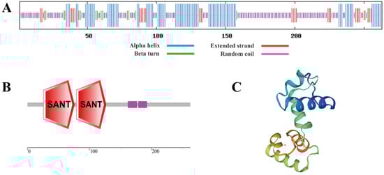 Prediction of SbMYB12 protein structure and domains. (A) Predicted protein secondary structure. (B) Predicted protein domains. (C) Predicted tertiary structure.