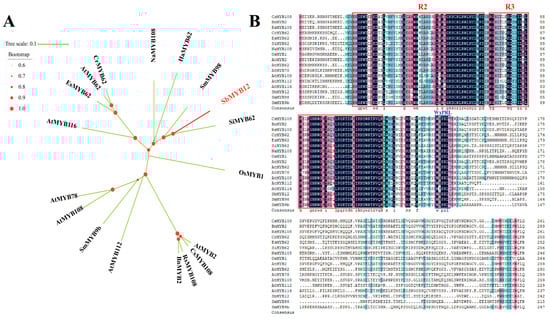 The determination of the MYB protein family’s evolution in plants (based on phylogenetic analysis of 18 SbMYB12-related genes from different species) revealed that SbMYB12 has higher homology with SiMYB62, SmMYB98, HaMYB62, and NaMYB62 (Figure 3A). Furthermore, the alignment of SbMYB12 with other S20 R2R3-MYB subgroup proteins from other species revealed that SbMYB12 shares the conserved R2 domain, R3 domain, and WxPRL motif, which characterizes the S20 R2R3-MYB subgroup protein domain (Figure 3B). According to these results, SbMYB12 possesses a highly conserved domain [,,].
