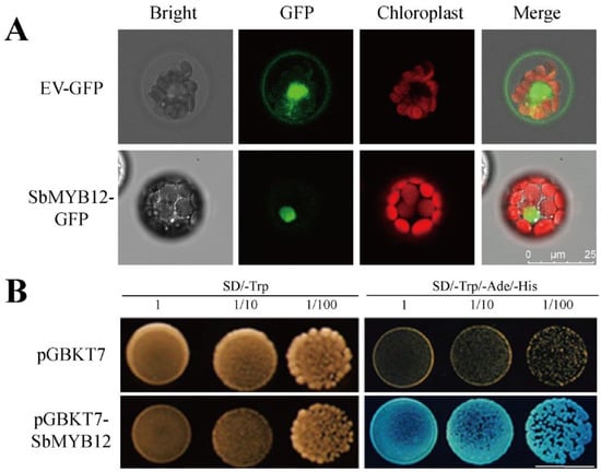 To further elucidate the classification of SbMYB12, we amplified the coding region of SbMYB12 and fused it to the HBT-GFP-NOS and pGBKT7 vectors, respectively. Subcellular localization analysis indicated that SbMYB12 was specifically localized within the nucleus (Figure 4A), which was consistent with our prediction []. Transactivating assays indicated that SbMYB12 had strong transcriptional activities in a yeast system (Figure 4B), likely functioning as a TF. These results indicate that SbMYB12 is a functional nuclear-localized transcription activator.