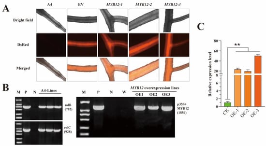 Identification of transgenic hairy roots of S. baicalensis. (A) Transgenic hairy root lines and observations with red fluorescent protein. A4: ArA4 lines (negative control); EV: ArA4 strain that harbors the pK7WG2R plasmids (positive control); MYB12-1~3: SbMYB12 overexpression hairy root lines. (B) PCR identification of transgenic hairy roots of S. baicalensis. PCR screening of SbMYB12 overexpressing lines. M: DNA marker (DL2000); P: ArA4 strain containing recombinant plasmid (positive control); N: S. baicalensis sterile plantlet (negative control); W: wild seedling of S. baicalensis. (C) Real-time quantitative PCR analysis of SbMYB12 in transgenic lines. CK1-3: ArA4 lines; OE1–3: SbMYB12 overexpression transgenic line; ** represents significant difference (p < 0.01) via Student’s t-test.