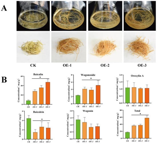 SbMYB12 promoted the accumulation of flavonoids (baicalin and wogonoside) in S. baicalensis transgenic hairy roots. (A) Phenotypes of the two-month-old SbMYB12-overexpression (OE) lines and the control (CK). (B) Concentrations of flavonoids in the transgenic hairy roots and the control (CK). Significant differences between the OE lines and the CK were identified (depicted by * p < 0.05) via Student’s t-test.