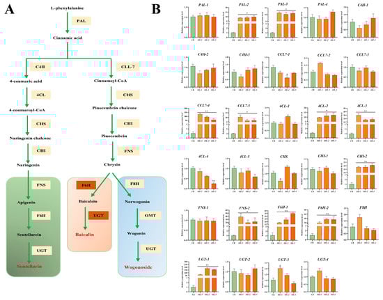 Expression analyses of enzyme genes for the flavonoid biosynthesis pathway in SbMYB12 overexpressed transgenic hairy roots. (A) Proposed biosynthetic pathway for flavonoids in S. baicalensis. (B) Flavonoid biosynthesis pathway gene expression analysis in SbMYB12 overexpressed strain. Significant differences between the OE lines and the CK were identified (depicted by * p < 0.05, ** p < 0.01) via Student’s t-test.