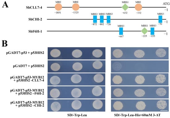 MYB proteins typically bind to the cis-elements of enzyme gene promoters to activate or repress their expression to regulate the biosynthesis of secondary metabolites. To further investigate the potential mechanism of how SbMYB12 regulates flavonoid biosynthesis, we analyzed cis-elements in the promoter regions of enzyme genes in the flavonoid biosynthesis pathway. We found MYB-binding elements (e.g., MRE, MBS1, and MBS3) in the promoter regions of SbCLL7-4, SbCHI-2, and SbF6H-1. Y1H assays were performed, which revealed that SbMYB12 interacts with the promoter regions of SbCLL7-4, SbCHI-2, and SbF6H-1 (Figure 8), indicating that SbMYB12 binds directly to the promoters of these genes and activates their transcription.