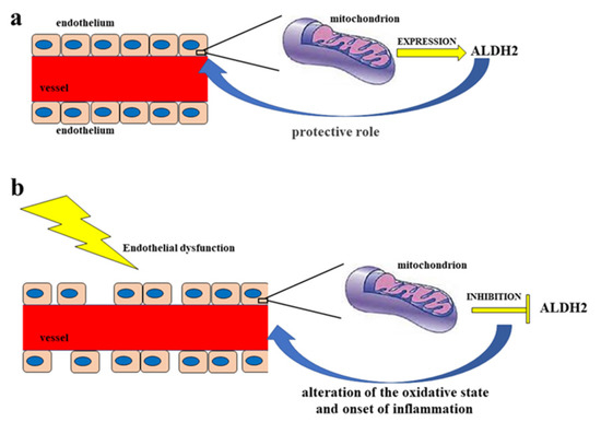 Double control of the endothelium regarding ALDH2. Diagram (a) represents a functioning endothelium with a proper mitochondrial expression of the enzyme ALDH2, which has a protective action on the endothelium itself. On the other hand, in diagram (b) the dysfunctional endothelium determines the inhibition of the mitochondrial synthesis of ALDH2, with a consequent negative effect on the endothelium, which is undergoing an alteration of the oxidative state and the onset of inflammation.