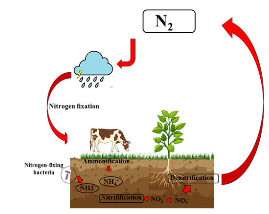 Nitrogen is a fundamental chemical element necessary to ensure the survival of living organisms. In fact, it not only constitutes 78% of the atmosphere, but is contained in the main macromolecules necessary to ensure life on earth: DNA, RNA, and proteins. Nucleic acids (DNA and RNA) are macromolecules formed by long nucleotide chains, in which nitrogen and phosphorus are particularly relevant; in particular, DNA depends on the order in which the four nitrogenous bases, adenine (A), thymine (T), cytosine (C), and guanine (G) are arranged. Proteins are also polymers: individual monomers are made of nitrogen, carbon, hydrogen, and oxygen [122]. However, nitrogen would not be available without some important chemical processes that transform atmospheric nitrogen into organic compounds. These chemical transformations are guaranteed by the nitrogen cycle, a “gaseous” biogeochemical cycle whose main reservoir is the atmosphere. Atmospheric nitrogen, whose molecular formula is N2, is formed by two nitrogen atoms strongly bound together to generate an inert gas, that is, a poorly reactive compound that hardly reacts with the surrounding environment. Because of this inertia, nitrogen is difficult to assimilate in the world of the living, making its organication necessary. In this process, known as “nitrogen fixation”, molecular nitrogen (N2) is split and made available for living beings who convert it into oxides of nitrogen (NOx) and ammonia (NH3). A subsequent process known as “ammonification”, carried out by fungi and various soil bacteria, is responsible for the acquisition of a proton by the ammonia, which generates the ammonium ion (NH4+). The latter can be nitrified by some bacteria free in the soil; initially, nitrosanct bacteria will transform ammonium into nitrite; later, nitrifying bacteria will transform nitrites into nitrates. Nitrates represent the most bioavailable form of nitrogen for plants: in fact, they are absorbed at a radical level, transformed into vegetable proteins and used as a source of nitrogen for the whole trophic network. The nitrogen cycle ends with the “denitrification” phase where some bacterial species perform an anaerobic respiration, in which nitrate represents the electron acceptor instead of oxygen, leading again to the formation of bimolecular nitrogen [123]. In Figure 3, a representation of the biogeochemical nitrogen cycle is represented.