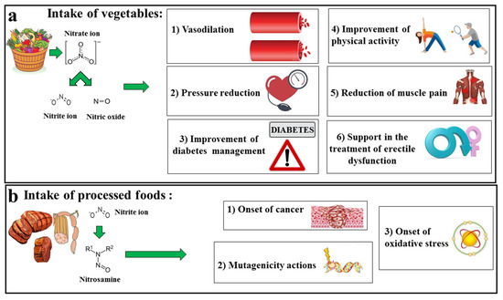 The protective and harmful roles of nitrogen compounds ingested through the diet. In diagram (a) the intake of plant products, which offer a large amount of nitrates, is shown. Subsequently, nitrates are transformed into nitrites and NO. The increased concentration of NO has beneficial effects on health, including vasodilation, reduction in blood pressure, better control of diabetes, better physical activities, reduction in muscle pain, and an improvement in the treatment of erectile dysfunction. In contrast, diagram (b) highlights the main effects from the intake of processed foods. The nitrites present in these foods can form toxic nitrosamines that are able to facilitate the onset of cancer, induce mutagenicity actions, alter biological macromolecules, and promote oxidative stress.