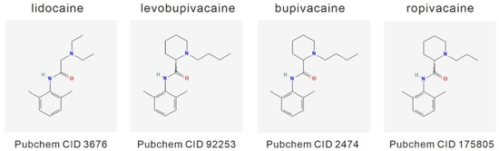 Local anesthetics are commonly used for dental and outpatient surgical procedures and the relief of localized pain. Two chemical structures, such as amide and ester types, of local anesthetics were developed; the former is metabolized by the liver and the latter is metabolized by plasma pseudocholinesterase, and their metabolites are excreted through urine [26]. Amide-type local anesthetics are more commonly used due to their better pharmacokinetic properties and lower incidence of adverse effects. Amide-type local anesthetics include lidocaine, levobupivacaine, bupivacaine, and ropivacaine (Figure 1).