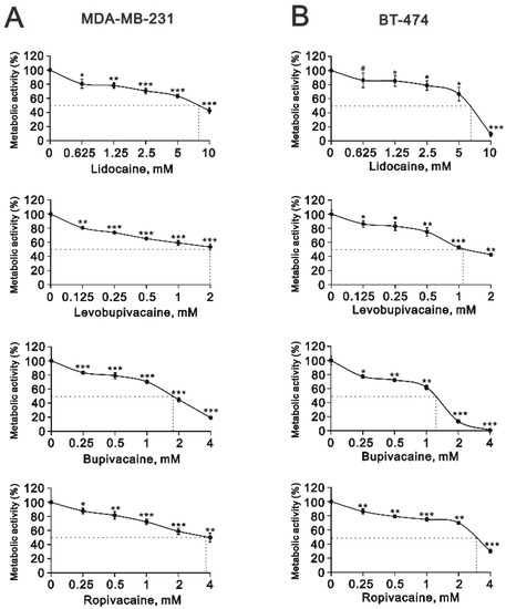 The effects of the local anesthetics on cell viability in MDA-MB-231 and BT474 cells. (A,B) MDA-MB-231 and BT-474 (8 × 104) cells that were treated with the indicated concentrations of lidocaine (0.625, 1.25, 2.5, 5, and 10 mM), levobupivacaine (0.125, 0.25, 0.5, 1, and 2 mM), bupivacaine (0.25, 0.5, 1, 2, and 4 mM), and ropivacaine (0.25, 0.5, 1, 2, and 4 mM) for 24 h. Control cells were cultured under identical conditions. Metabolic activity was measured using an MTT colorimetric assay. Data are presented as a percentage of the control. Bars depict the mean ± SD. # p > 0.05; * p < 0.05; ** p < 0.01; *** p < 0.001.
