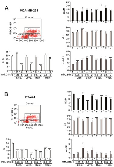 The effects of the local anesthetics on cell cycle profiles in MDA-MB-231 and BT-474 cells. (A) MDA-MB-231 and (B) BT-474 (3 × 105) cells were treated for 24 h with the indicated concentrations of the local anesthetics. After treatment, the cells were stained with 7-Aminoactinomycin D (7-AAD), which is a dye that can bind to total DNA, coupled with immunofluorescent BrdU staining. Four cell subpopulations (i.e., subG1, G1, S, and G2/M phases) were distinguished based on bivariate BrdU incorporation and DNA content distribution (7-AAD staining): cells in the sub-G1 phase had a lower DNA content (hypodiploid); cells in the G1 and G2/M phases were DNA diploid and tetraploid, respectively; thus, the G2/M phase fluoresced twice as brightly and there was no BrdU incorporation; cells in the S phase had the highest and relatively constant BrdU levels. The 7-AAD staining intensities defined the cell cycle position. The cell cycle profiles were measured using flow cytometry analysis. The results are representative of two independent experiments. Bars depict the mean ± SD. # p > 0.05; * p < 0.05; ** p < 0.01; *** p < 0.001.
