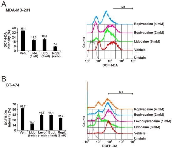 The effects of the local anesthetics on cell ROS status in MDA-MB-231 and BT474 cells. (A) MDA-MB-231 and (B) BT-474 (3 × 105) cells were treated for 24 h with the indicated concentrations of the local anesthetics. The cell ROS status was determined using 20 µM of DCFH-DA and measured using flow cytometry. The cell volume gating strategy involved FSC-H and SSC-H. The median DCFH-DA fluorescence intensity of the vehicle was used as the starting point for M1 gating. The results are representative of two independent experiments. Bars depict the mean ± SD.